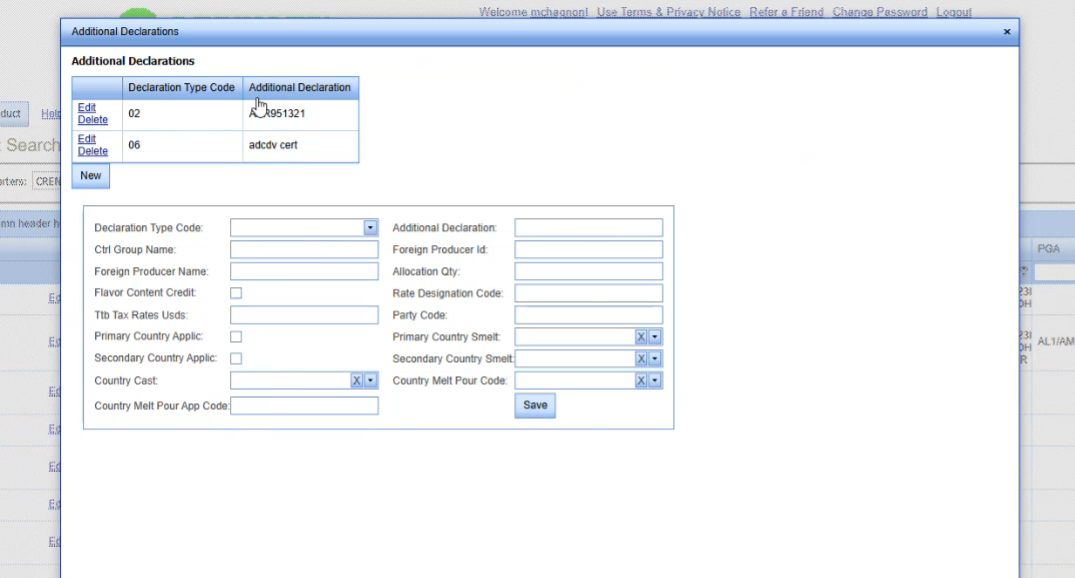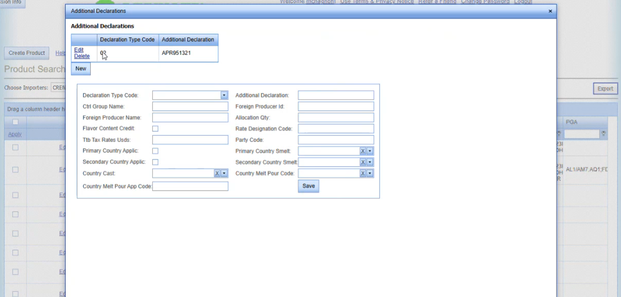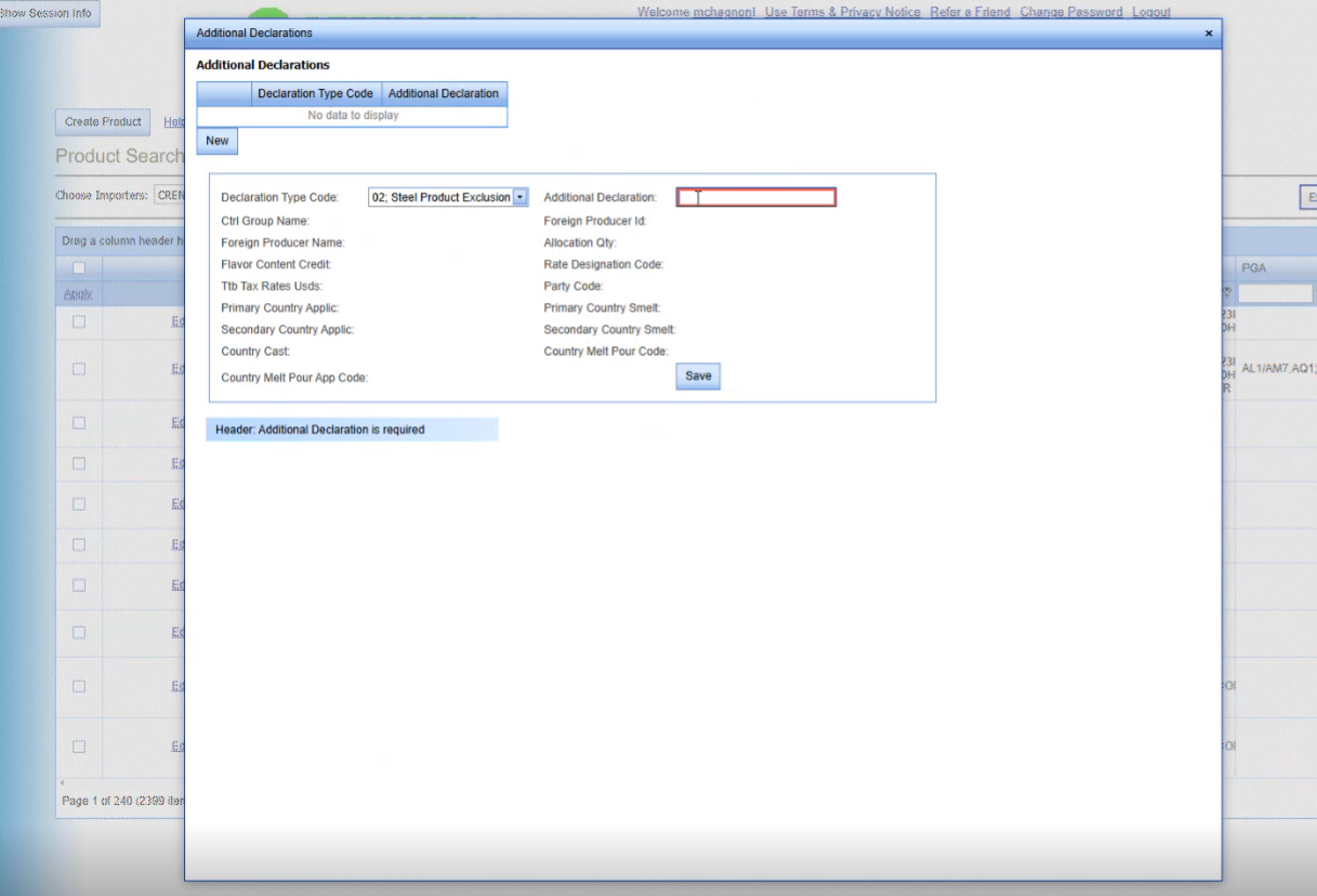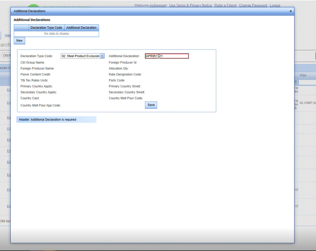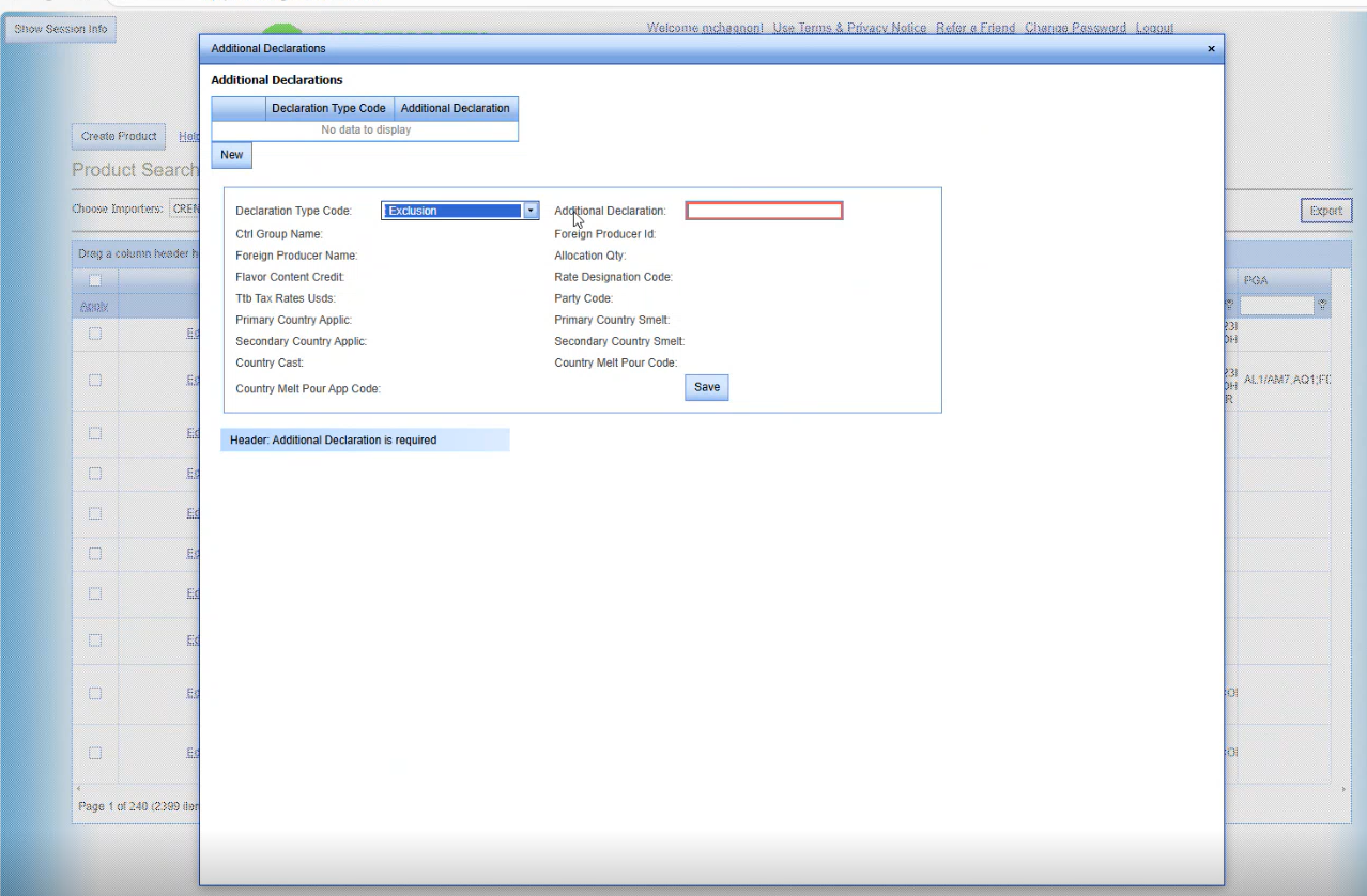 We will go over all of the fields and then you, the user should know based on the declaration type that you need to apply, what data elements are required for that specific Part Number.