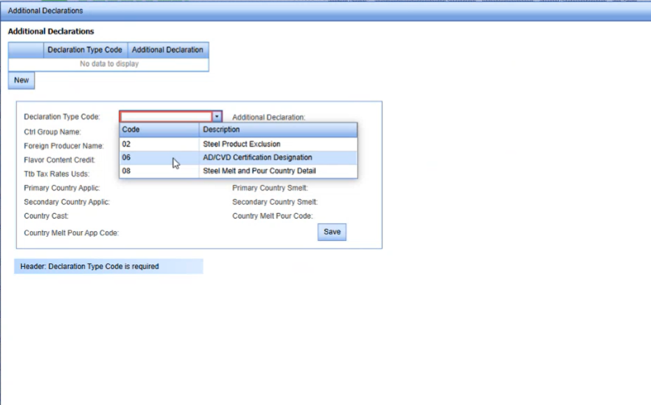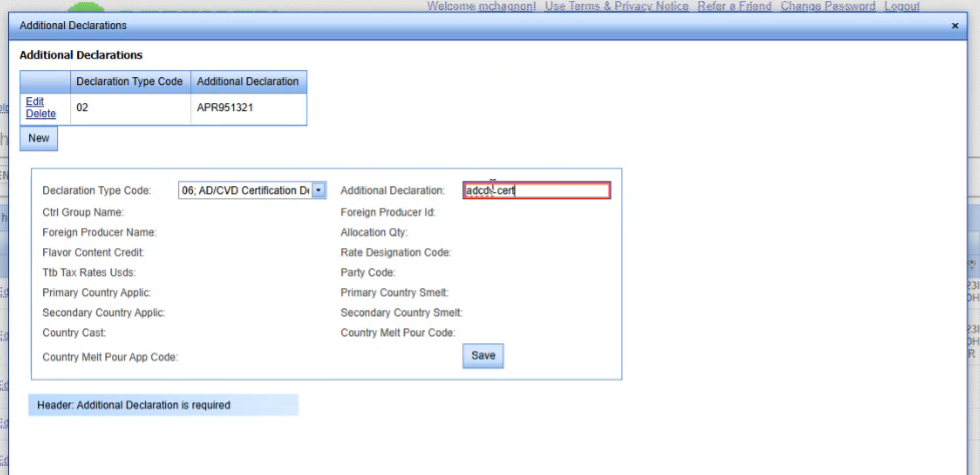 So We are just going to go ahead and add the 06 here. We'll pretend that it applies. So We've put in the 06, which is your ADCVD certification. What we will enter on this and it'll be consistent across the board is ADCVD space cert. It doesn't matter if you put it in upper or lower case and then click on save.