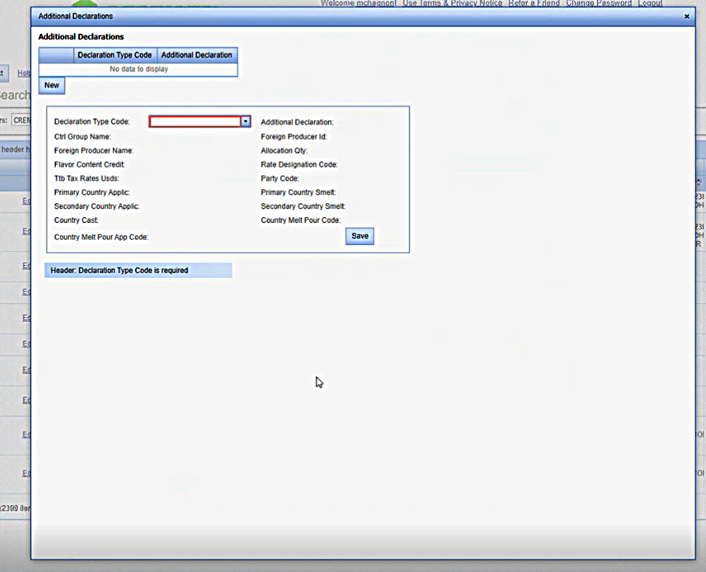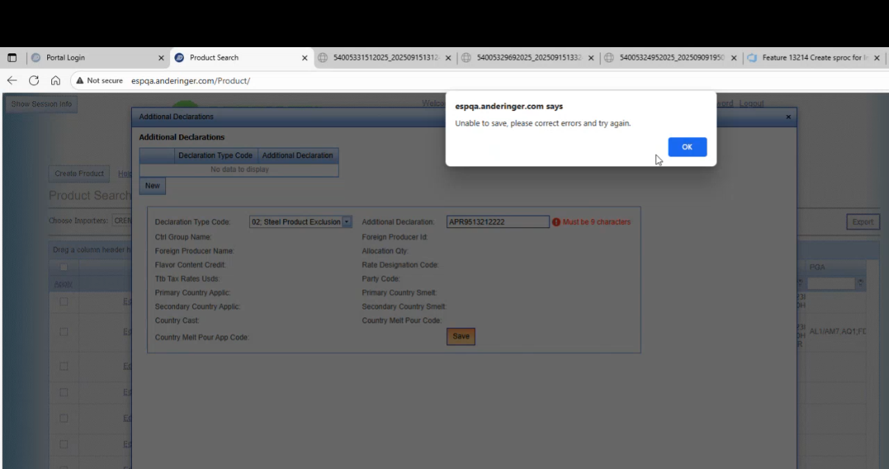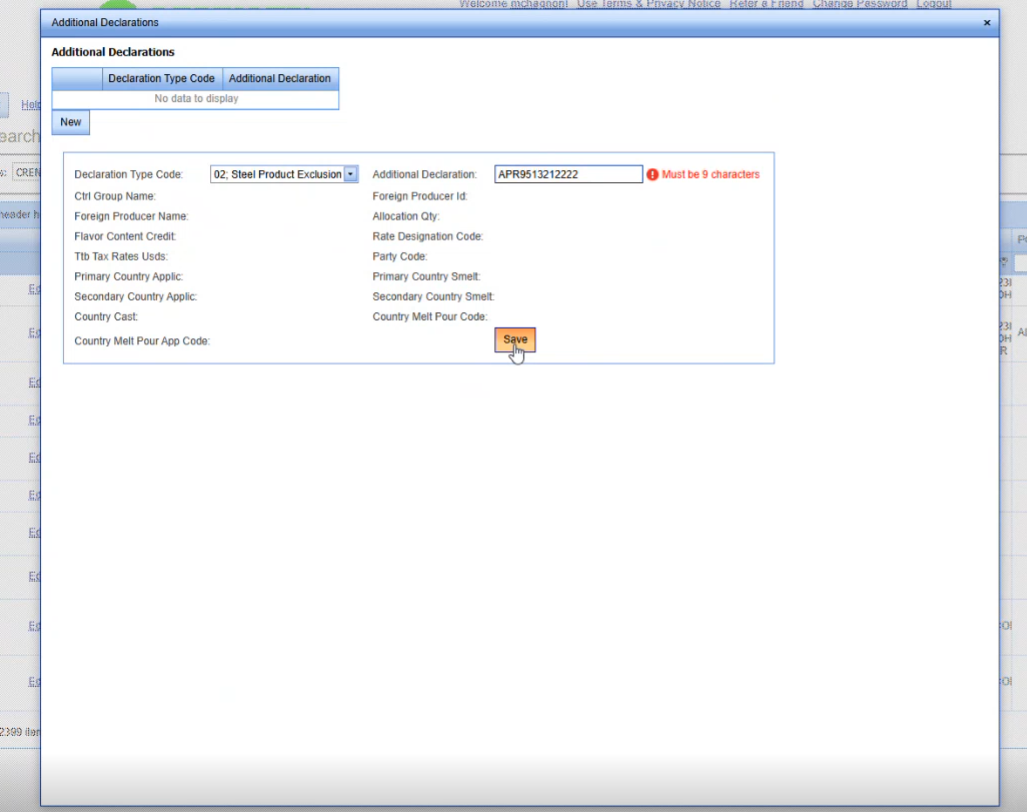 We are going to going to put in a declaration type 95132. And will add some extra characters to the end and we will click on Save and it is going to come up and tell us that it's unable to save, but you also see the validation error here saying that it has to be 9 characters.